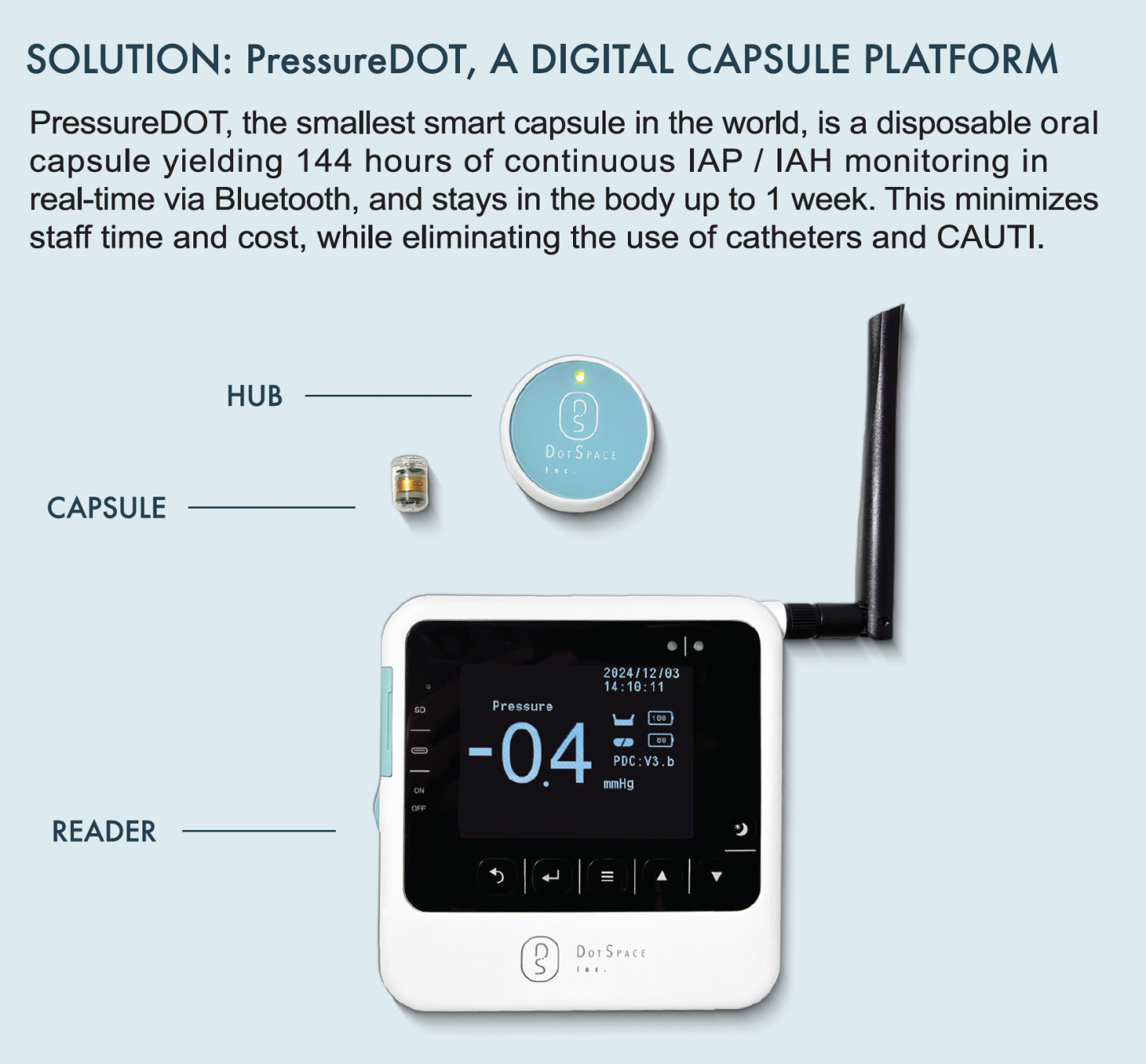 | PressureDOT 是目前市場上體積最小且具備壓力與溫度雙感測功能的膠囊型醫療裝置。其微型化與模組化設計不僅提升病患舒適度,也可依不同臨床需求擴充感測功能。相較於傳統影像或pH膠囊,PressureDOT 更專注於壓力生理監測,開啟以壓力量測預測臨床重症的新篇章。 |
